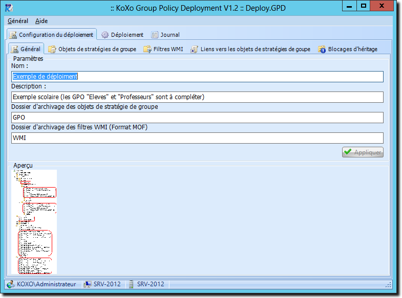 L'outil KoXo GP Deploy qui est fourni avec KoXo Administrator permet de capturer et de déployer ensuite en masse une configuration totale : Objets GPO, Filtres WMI, Liens WMI, Liens OU, Blocages héritage.