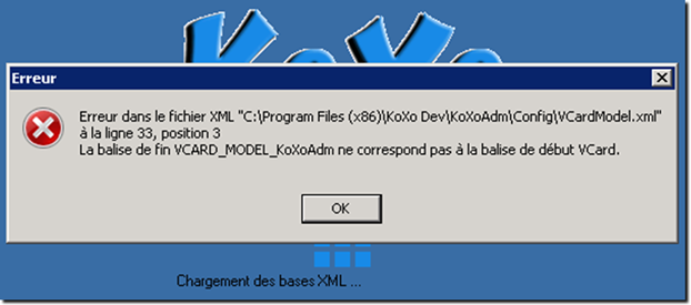 Ceci est du au fait que les formats XML sont vérifiés au démarrage, or il le fichier VCardModel.XML contient une erreur de balsie en fin de fichier, il n'y a aucun impact sur le fonctionnement de KoXo Administrator.