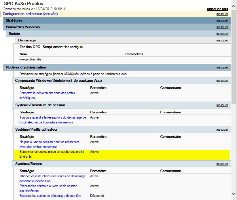 On peut vérifier que ce paramètre est bien pris en compte par des diagnostics de GPO mais aussi en vérifiant la base de registre :